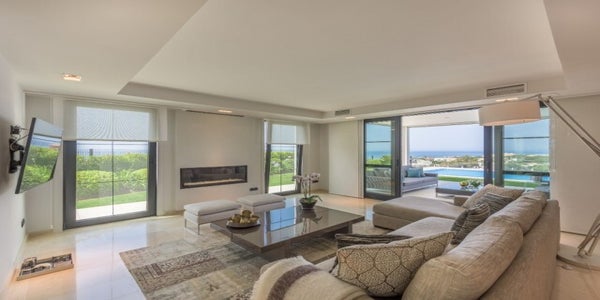 Modern contemporary villa in Cabopino, Marbella. A stroll away from the dunes and charming port of Cabopino. This villa is built on an elevated plot, giving the villa exquisite panoramic views towards Gibraltar and Africa.